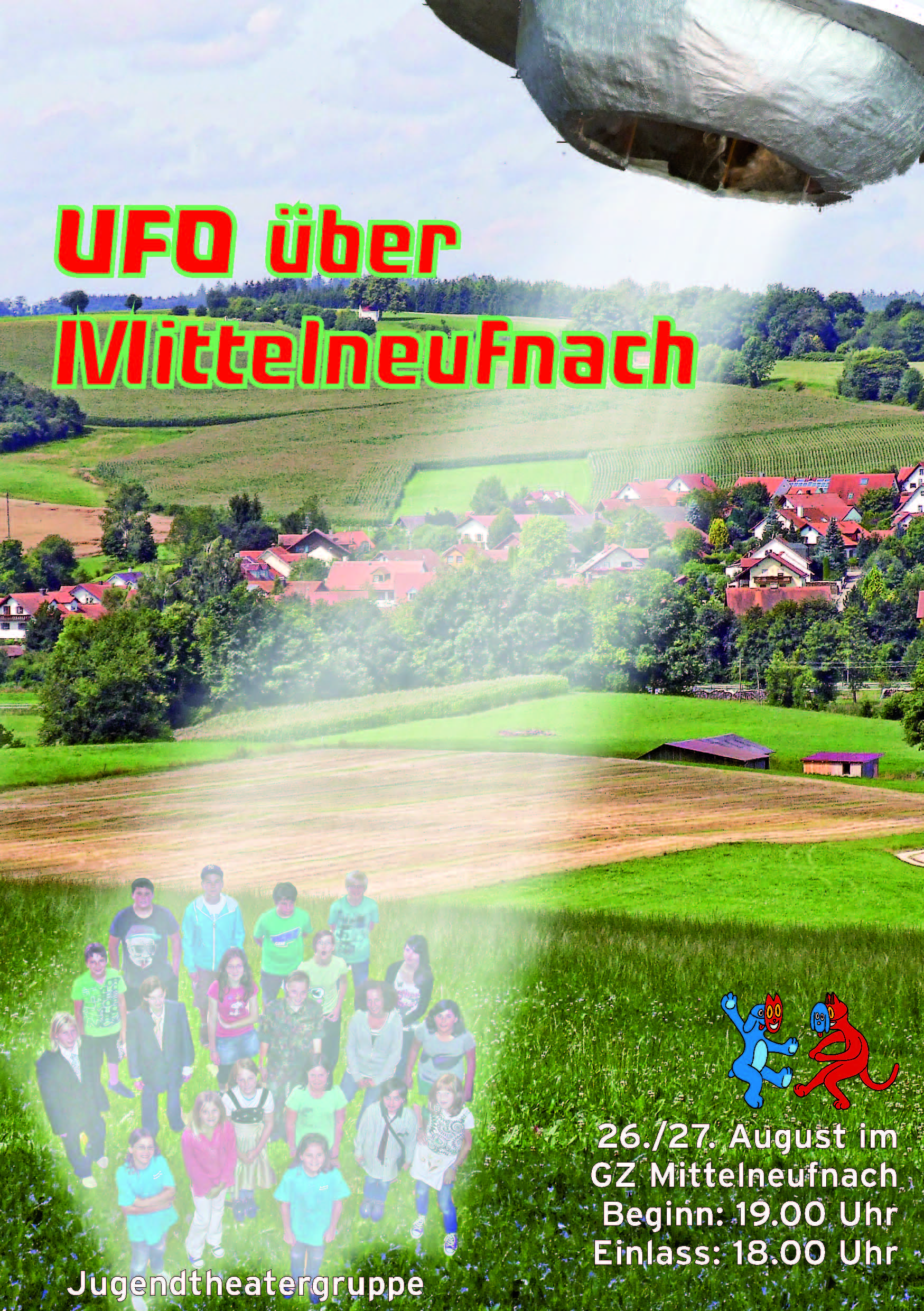 UFO über Mittelneufnach Ein wahnwitziger Schulschwank Im Rahmen des Ferienprogrammes 2011 spielte die Jugendtheatergruppe der Theaterfreunde Mittelneufnach im Gemeindezentrum. Mit Kaffee, Staudengeist und Valium versuchte der Schuldirektor (Franziska Miller) seiner Ratlosigkeit zu begegnen, als ihn seine Dorfschüler auf die seltsame Erscheinung vor ihrem Klassenzimmerfenster aufmerksam machten. Denn nach dem Filmereignis 1985 in den Stauden mit...